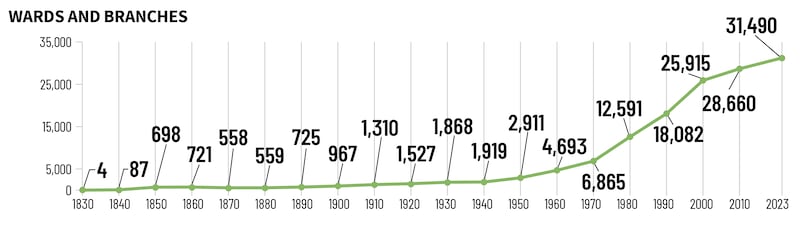 The number of wards and branches increased from 31,330 to 31,490 during 2023, and the number of stakes from 3,521 to 3,565.